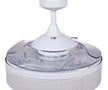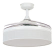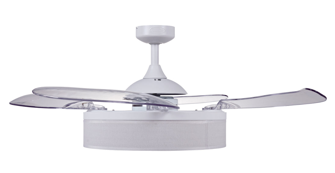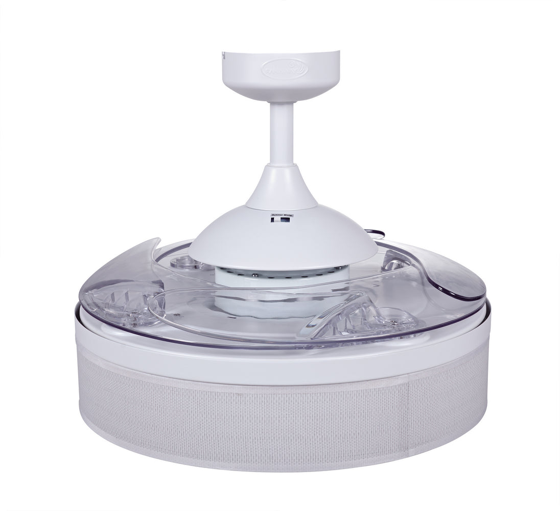 The Australian Original FANAWAY Fraser White with Clear Blades is an advanced ceiling fan with unique aesthetics and energy efficient design. Switched off, the traditionally intrusive fan blades automatically retract and conceal, transforming the unit into a stylish linen drum light pendant. It creates open space in the room environment, accumulates less dust, and is unobtrusive and versatile to visually integrate into all rooms of you home. The fan comes with a dimmable LED light, 3 speed remote control, winter/summer mode and wall mount for you to personalize your experience. The star of this Fanaway design is the light kit which has a hand-crafted white PVC linen shade that is not only beautiful but easy to clean. The frosted acrylic diffuser at the bottom softens the glare of light and guarantees gentler illumination. Additional downrods lengths sold separately: 12``, 24`` and 36`` - 210544120, 210544240, 21044360. US Patent 8317470, US Patent 8807938, US Patent 8790085, US Patent 9255584, US Patent 8851841. Set includes: One (1) ceiling fan with remote control. Material: Metal (fan housing) and PC - Polycarbonate (blades) . Finish: White. Ceiling fan dimensions: 15.75 inches high x 48 inch wide x 48 inches deep. Blade dimensions: 17.7 inches length x 4.1 inches width, Blade color: Transparent. Winter/Summer mode manual switch. Motor size (inch): D153 x 15. Airflow(CFM): 4172.69. Number of speed: 3. Power Consumption Average(wattage): 60. Motor Wattage: 60W. Include 3 x 10W E26 Base A19 LED bulbs included, each bulb 2700K 800LM. Socket: E26, Dimmable. RPM H/M/L (motor speed): 223/163/122. Fan Watts when used at high speed: 60W. Voltage: 110V. Ceiling Fandimensions: 15.75 inches high x 48 inches wide x 48 inches deep. This product will ship to you in one (1) box. Accessories pictured are NOT included. Assembly required.