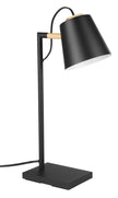 The Lacey table lamp by Eglo features a structured black finish w/ a natural wood accent. The metal shade is adjustable and has a structured black exterior and white interior finish. The black plug in cord measures 59`` long