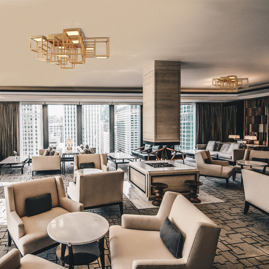Inspired by shadow box wall art, multiple cubes outlined by plated-gold frames are positioned in dimensional patterns and illuminated by LED panels to create a dramatic visual effect.