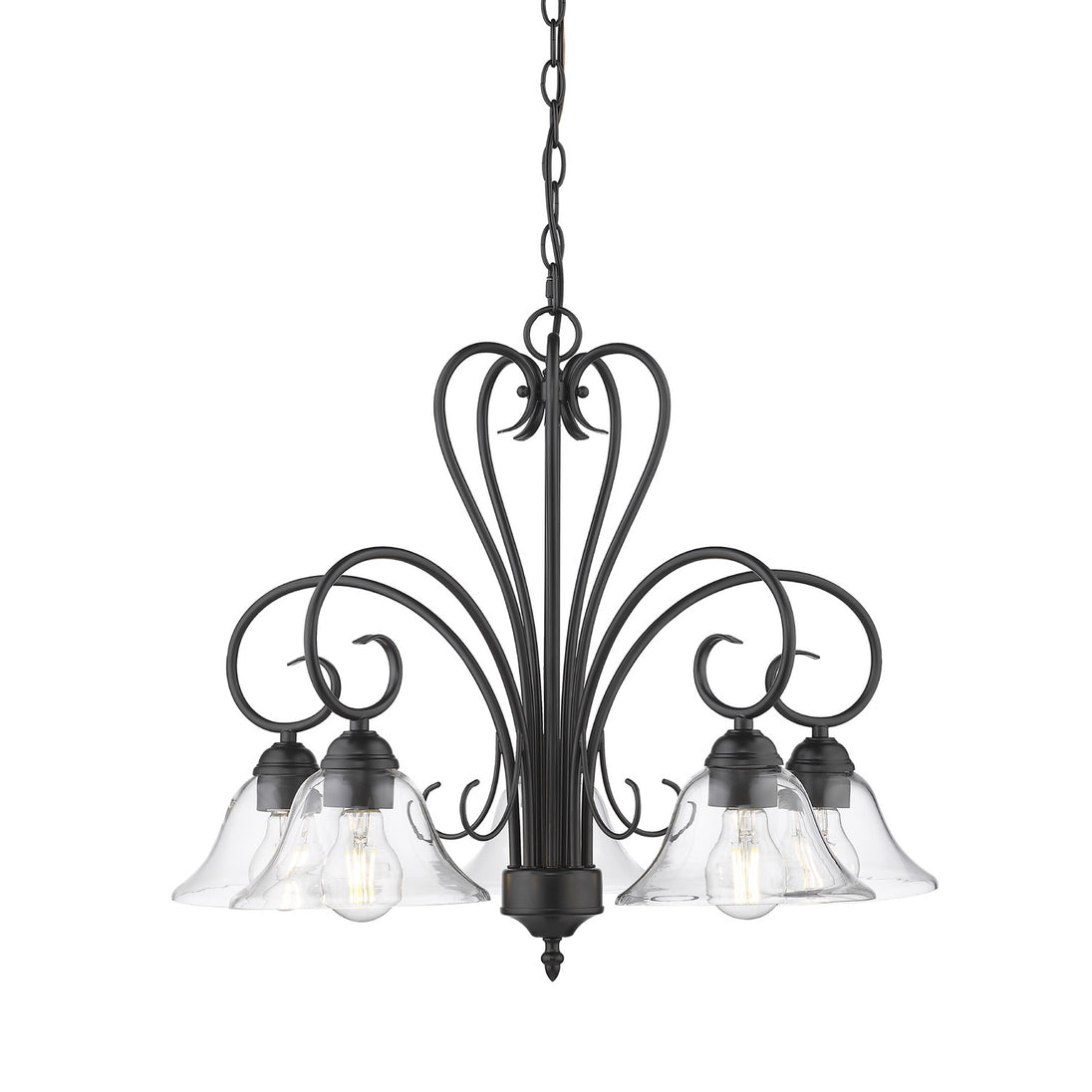 Earthy tones and organic lines make the Homestead collection a comforting addition to the transitional style home. Whether the decor is eclectic, casual, or even traditional, Homestead pieces blend well in cozy environments. Available in multiple finishes, these options give depth and weight to the collection's delicately curved arms. A selection of glass options partner perfectly with these finish options. This 5-light nook chandelier creates a stylish focal point, ambient downlighting, and is comfortably sized for intimate dining and living areas.