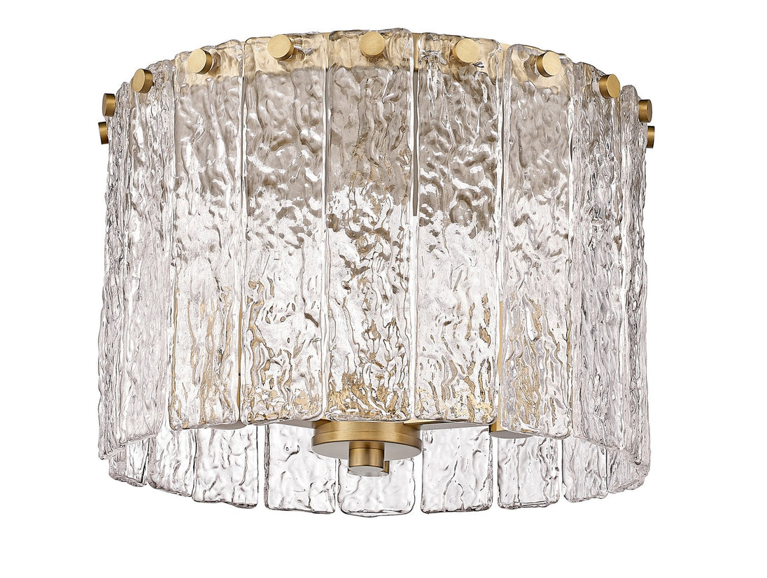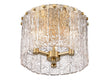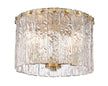 Gleaming metal and glass circle around compelling artistry to create a standout fixture perfect for both modern and transitional settings. The Glacier three-light flush mount ceiling light offers a decadent look of individual textured glass panels that emulate melting ice, an extraordinary effect with dramatic impact in a kitchen or entryway setting. Lush modern gold finish steel creates a chic frame and canopy, adding consistency in both style and finish and embellishing the optical delight accomplished when the fixture is illuminated.