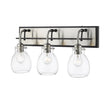 Sleek lines and clear, rounded details combine on this three-light bath light. Stunning above a bathroom vanity, the glass shades cast a bright glow from the dual tones of matte black and brushed nickel.