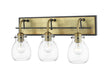 Rich, warm vibes add a sense of tradition to the transitional motif of this three-light bath light. Delicate clear glass shades play off the sleek look of olde brass finish with matte black accents, delivering a stylish fixture.
