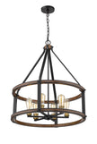 Warm up a large dining room with the rich rustic mahogany tone of this six-light pendant light. Full of sleek lines, the faux barnwood construction creates an open silhouette.