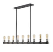 Shine brilliance in a kitchen or dining room with the elongated shape of this nine-light pendant light. The sleek silhouette showcases faux barnwood and barnboard in a distressed ashen hue, complete with industrial exposed lightbulbs.