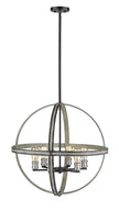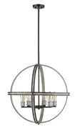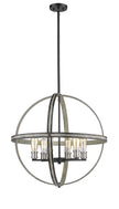 Transform an entryway with the open, airy feel of this six-light pendant light. Complete with faux barnwood rings and barnboard accents, the ashen frame nestles exposed and suspended lightbulbs inside.