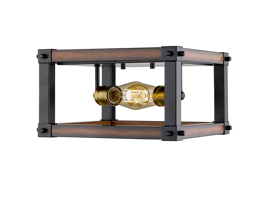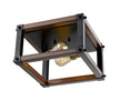The streamlined silhouette of this two-light ceiling light is transformed with deep tones of rustic mahogany. Exposed lightbulbs nestle inside the open frame for a fixture that is both sophisticated and modern.
