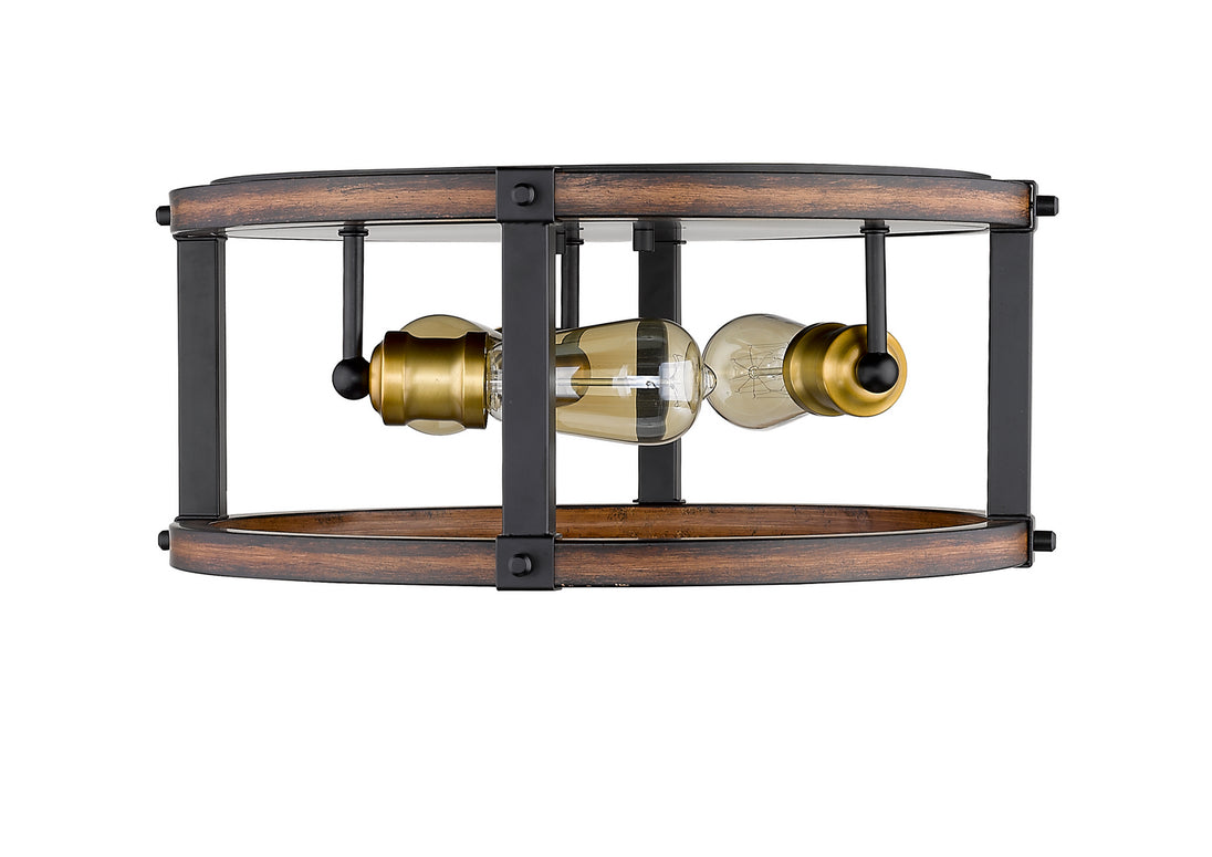 Revel in the richness of rustic mahogany from this three-light ceiling light. The sleek faux barnwood construction features an open silhouette with exposed lightbulbs.