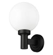 Mid-Century Modern simplicity takes a whimsical turn in the design of a fixture created for pure artistry. From the Laurent collection comes a one-light outdoor wall sconce offering a retro-influenced motif and a dose of Art Deco attitude. A cheery opal white glass globe shade and cylindrical black finish aluminum frame gives this wall sconce eye-catching palette contrast.