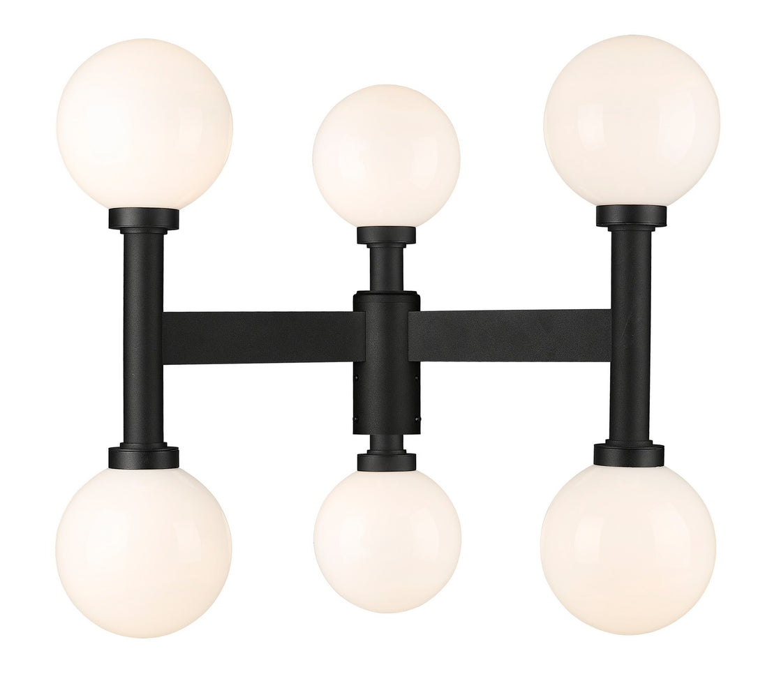 Perfect for large exterior spaces needing extra reach in illumination, the Laurent six-light outdoor post mount fixture offers a charming aesthetic with a contrasting palette and whimsical design. Crafted of black finish aluminum, its straight-line frame delivers stellar versatility and a sleek look. Six charming opal glass globes positioned vertically put a retro stamp with festive artistry on this outdoor fixture.