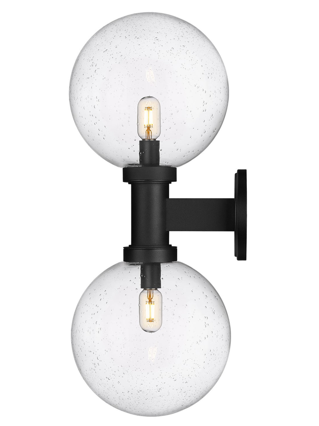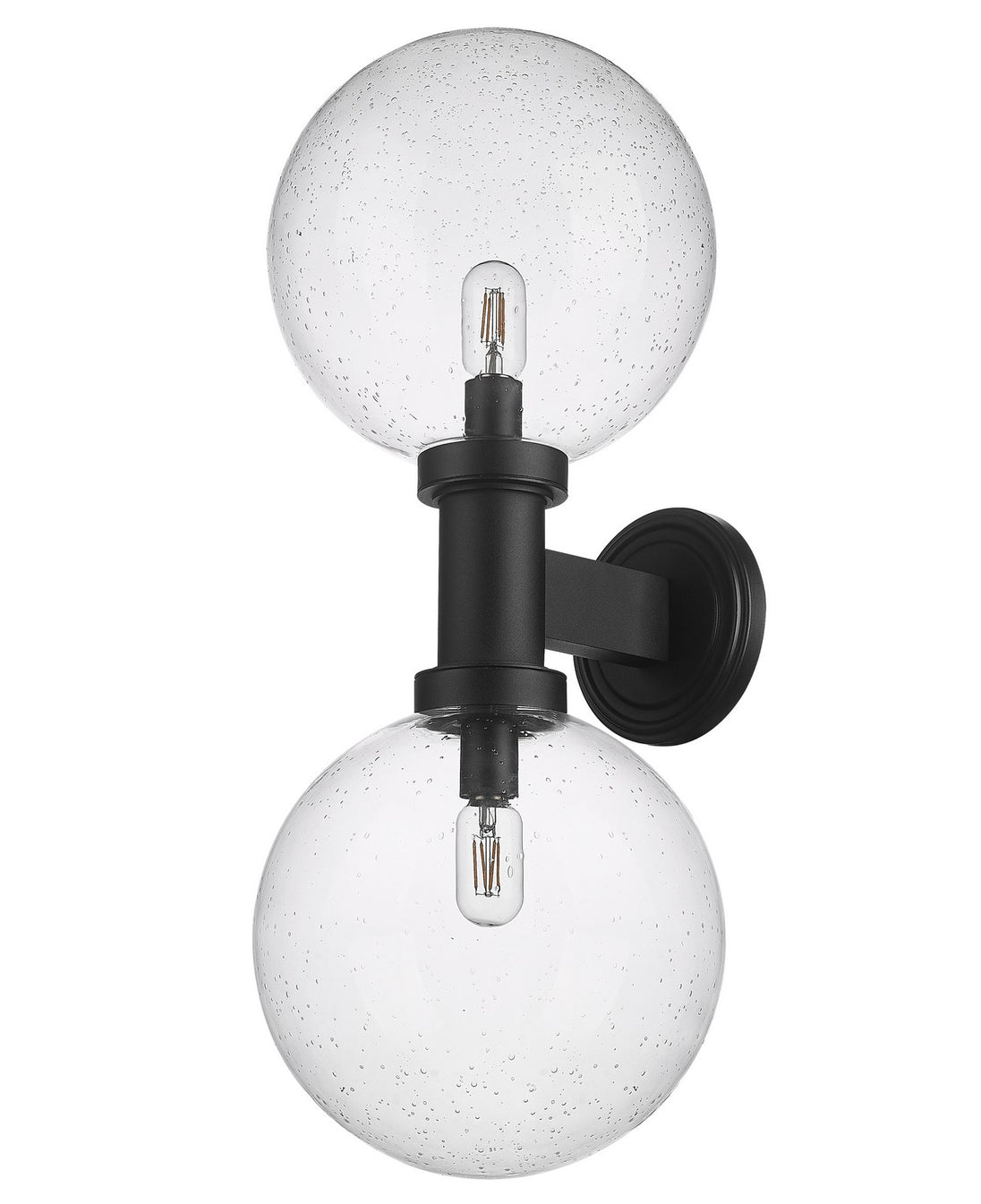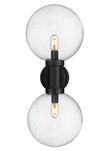 Chic elegance follows a dose of Mid-Century Modern vibes when this charming exterior light fixture elevates sophistication on a residential structure or deck space. From the Laurent collection comes a two-light outdoor wall sconce with a linear and circular blend of silhouetting. A simple yet tasteful black finish aluminum frame and wall plate hosts dual globe shades fashioned of delicate clear seedy glass.