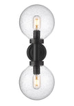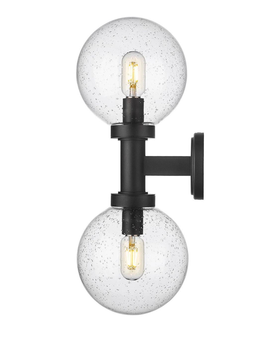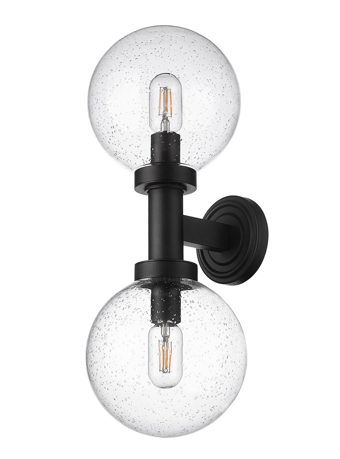 Lighting plays into a décor scheme focused on sheer style. From the Laurent collection comes a two-light outdoor wall sconce with a linear and circular blend of silhouetting. A simple yet tasteful black finish aluminum frame and wall plate hosts dual globe shades fashioned of delicate clear seedy glass.
