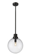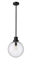 This one-light outdoor pendant from the Laurent collection reinforces a simple yet stylish Mid-Century Modern motif. Light up a deck or patio space with this cheery fixture reflecting a hint of storied village nautical attitude. Suspending from a black finish aluminum canopy and down rod, its chic, delicate clear seedy glass globe delivers the ultimate in sophistication.