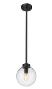 Mid-Century Modern attitude creates retro inspiration in a fixture that dazzles in an outdoor space. Light up a deck or patio with this cheery one-light outdoor pendant reflecting a hint of storied village nautical attitude. Suspending from a black finish aluminum canopy and down rod, its chic, delicate clear seedy glass globe delivers the ultimate in sophistication.