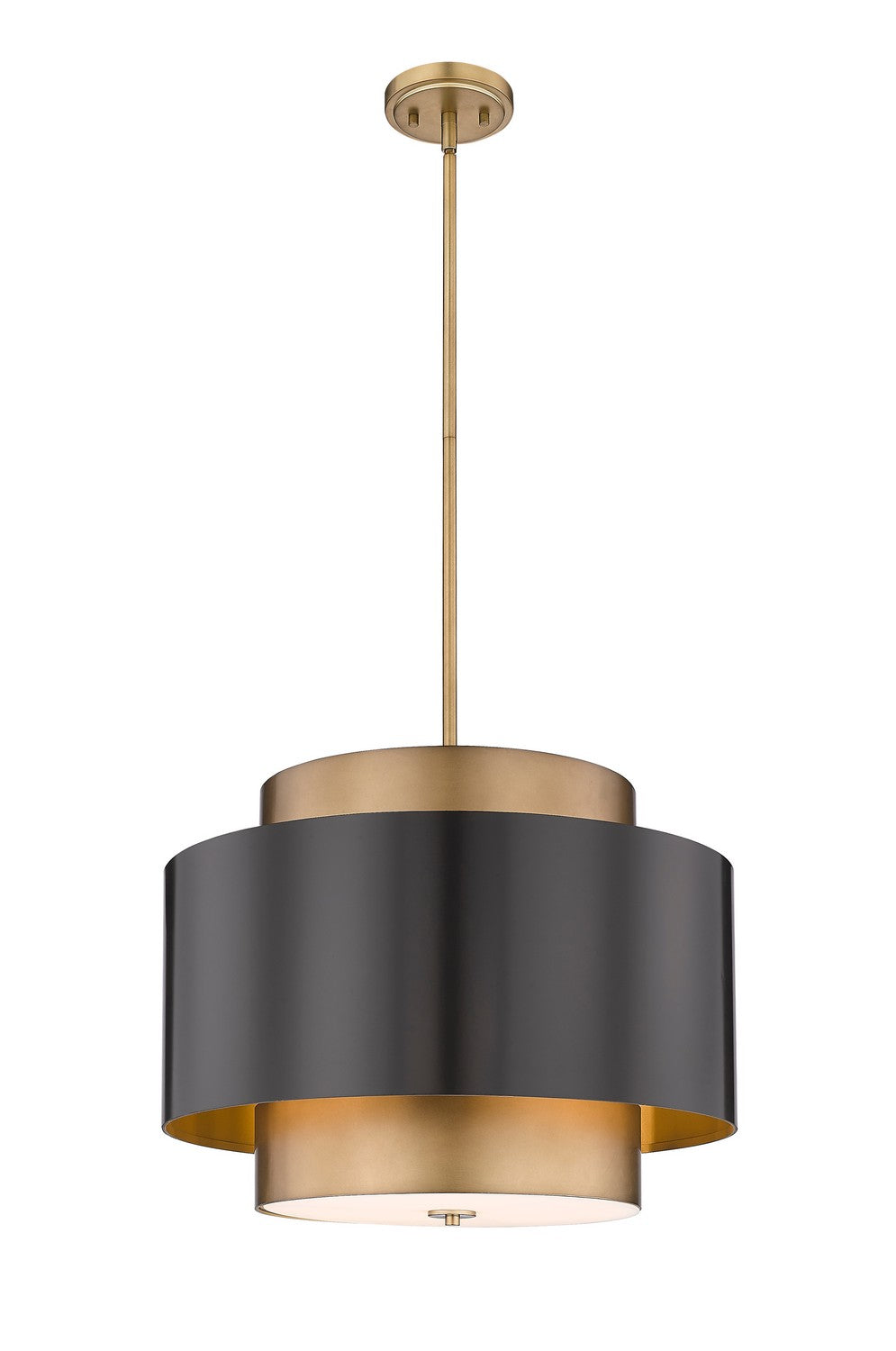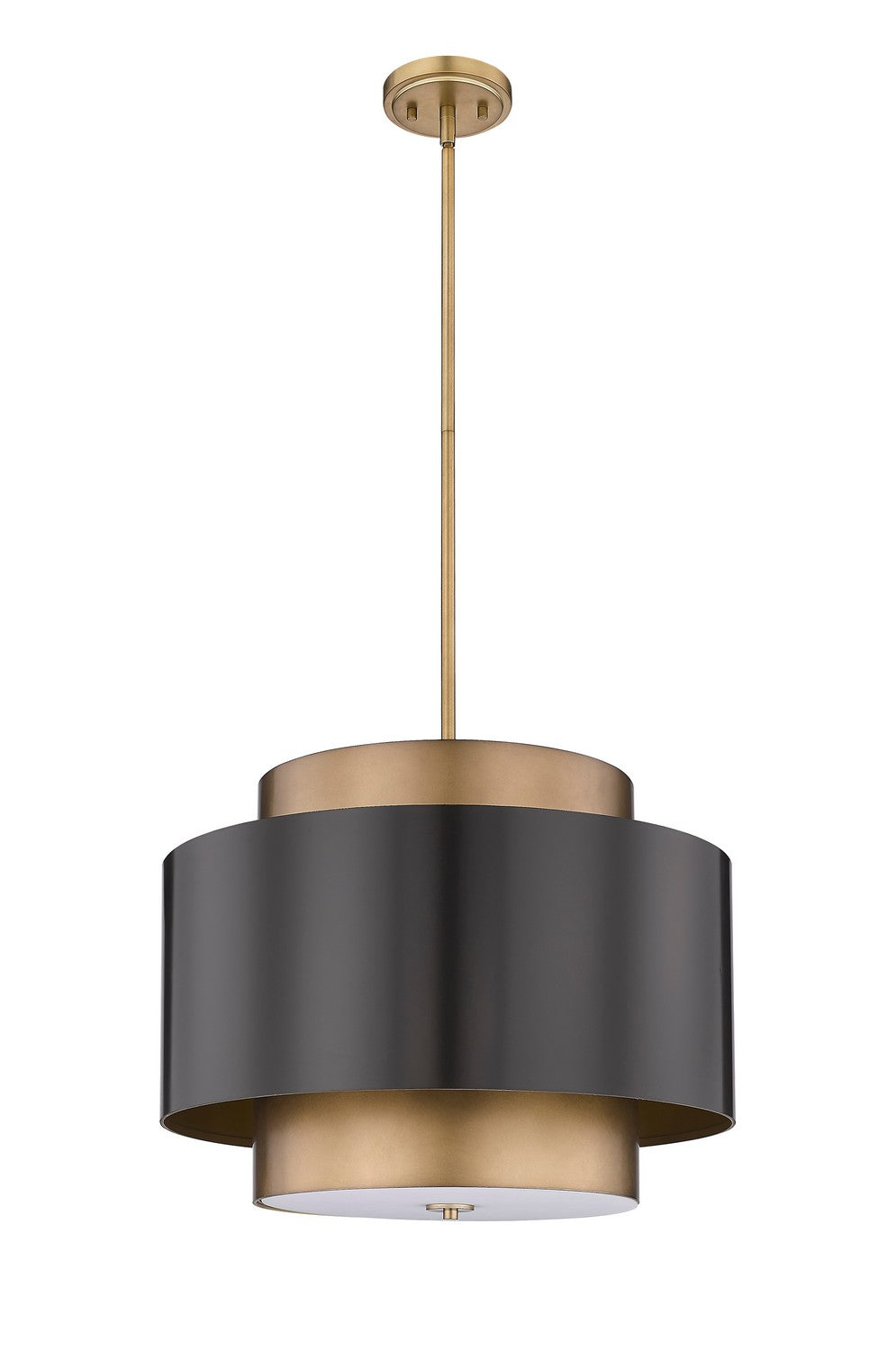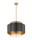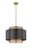 A layered, double drum design creates a bold, designer look for the impressive Harlech collection three-light pendant. Walking the line between modern and industrial design motifs, this steel fixture is a charming addition. Perfect for the foyer or over a breakfast nook, the pendant boasts a warm rubbed brass inner drum, with a shorter, wider bronze finish drum layered on top for a dimensional look and feel.