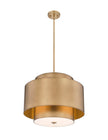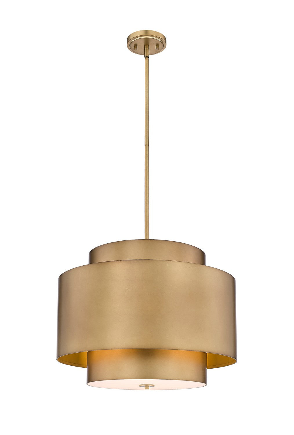 A layered, double drum design creates a bold, designer look for the impressive Harlech collection three-light pendant. Walking the line between modern and industrial design motifs, this steel fixture is a charming addition. Perfect for the foyer or over a breakfast nook, the pendant boasts a warm rubbed brass inner drum, with a shorter, wider drum layered on top for a dimensional look and feel.