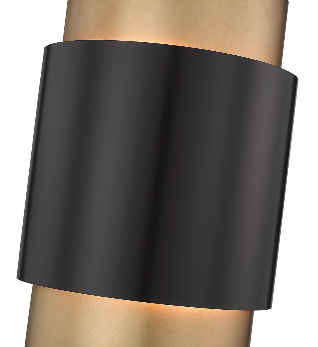 Expertly crafted in steel, this modern two-light wall sconce delivers a touch of Art Deco elegance to your living area or entryway. Its layered drum shade boasts a slender interior cylinder in a warm rubbed brass finish, complemented with a shorter and wider cylinder in a deep bronze finish. Refined without overwhelming surrounding decor, this sconce is a charming addition.