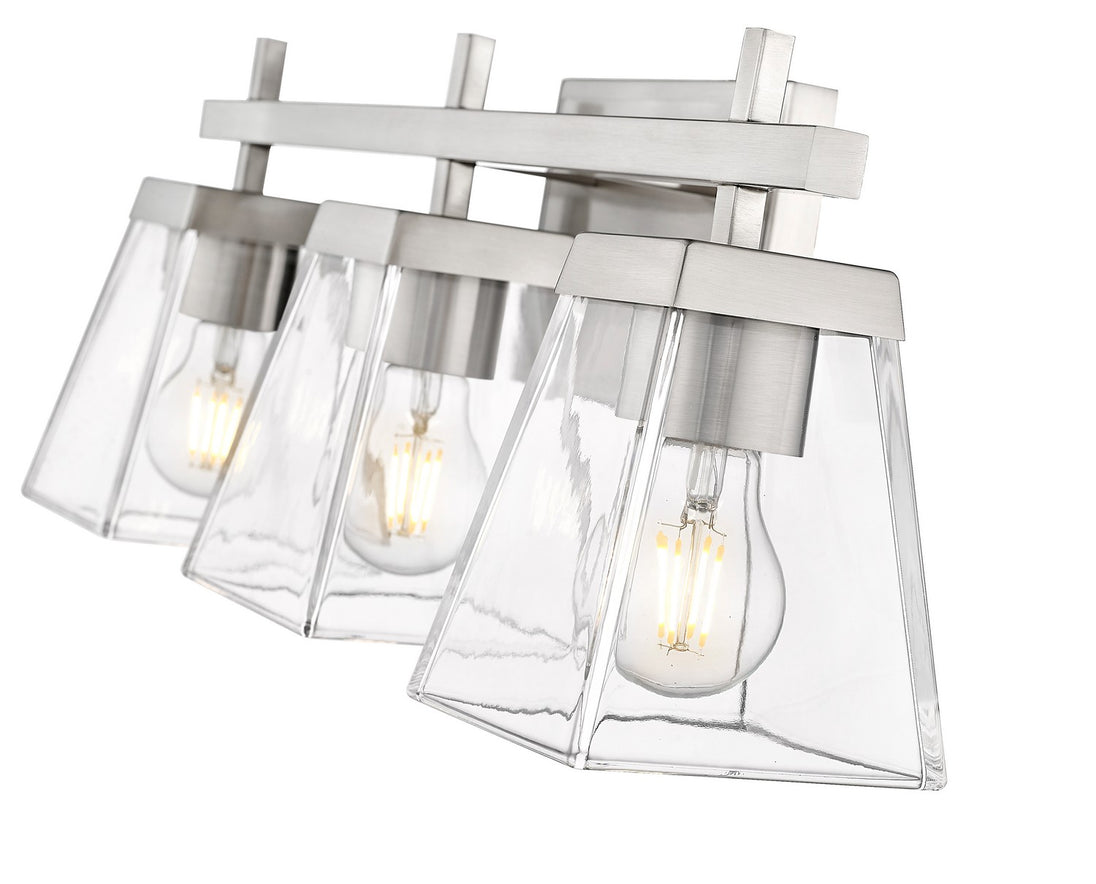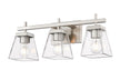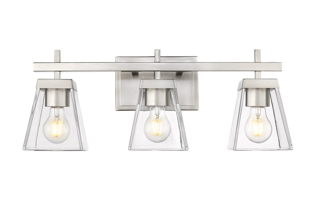 Clean precision defines the impeccable, soothing design of a three-light vanity wall light from the modern Lauren collection. Its steel frame boasts a straight bar hosting a trio of flared, clear glass shades that can be mounted pointing up or down to best suit your space. A bright brushed nickel finish offering a smooth, spa-like energy to your bathroom vanity.