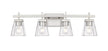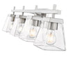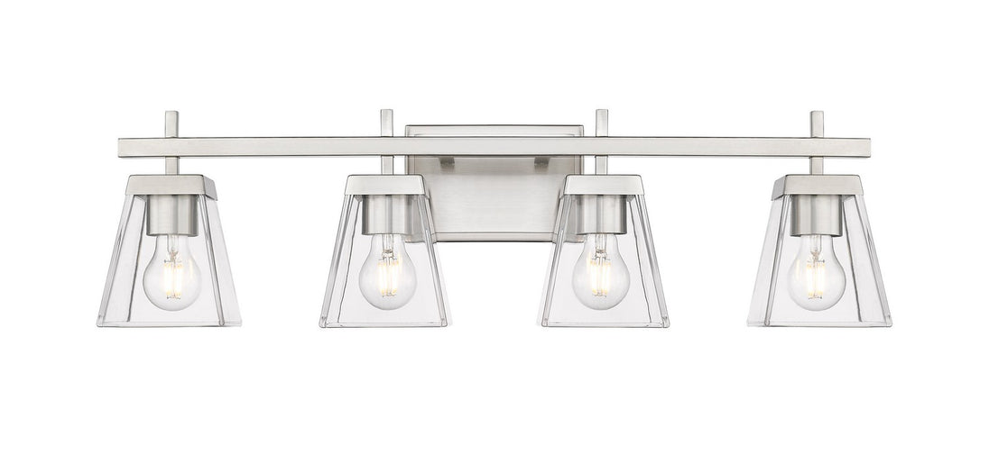 Straight lines and chic angles create a compelling, Zen-inspired silhouette for this modern four-light bathroom vanity wall light. From the Lauren collection, the sconce boasts a clean, straight bar hosting a quartet of clear glass shades that may be mounted up or down. Their flared design perfectly emphasizes the soothing style of a contemporary fixture that's beautifully accentuated with a sleek brushed nickel finish.