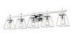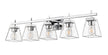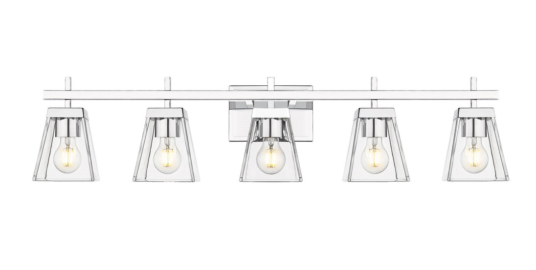 Designed to span a generous vanity, this modern five-light vanity wall light is an intriguing addition with soothing, spa-like energy. Delivering a precise, clean look and feel, the sconce pairs flared, clear glass shades with linear framework in a crisp chrome finish. Steel construction ensures reliability for a fixture that may be mounted with its lights pointing up or down.