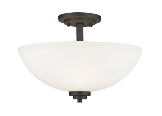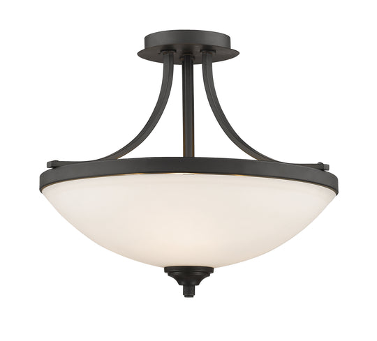 3 Light Semi Flush Mount --- The contemporary Savannah family adds sophistication to home décor. The beautifully appointed olde bronze fixture is perfectly paired with matte opal glass shades in this 3 light semi flush mount....Regular price $234.00 -