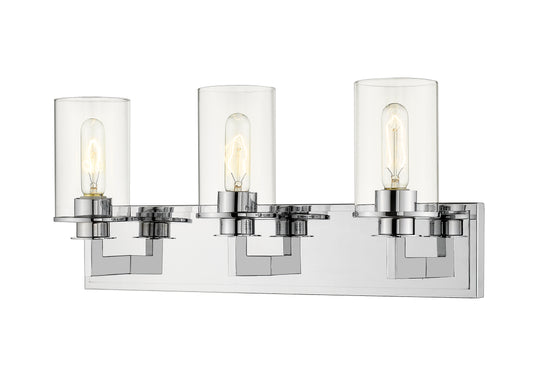3 Light Vanity The contemporary Savannah family adds sophistication to home décor. The beautifully appointed chrome fixtures are perfectly paired with clear glass shades. Audaciously stylish with slim angled lines, this mid-century modern three-light vanity is...Regular price $234.00 -