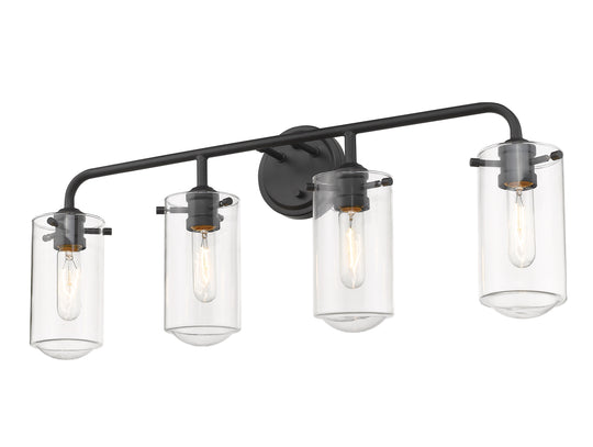 4 Light Vanity Vintage detailing and modern styling mix to create the Delaney collection. Clear drop glass shades are paired with vintage industrial detailing and finished in your choice of either Matte Black or Brushed Nickel....Regular price $196.00 -