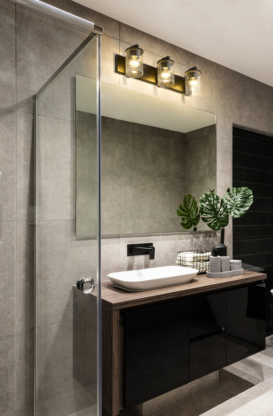3 Light Vanity Classically simple, this transitional design is perfect for today’s home. The graceful rectangular arms gently curve to support the clear seeded glass shade. Offered in a choice of Matte Black, Brushed Nickel, and...Regular price $204.00 -