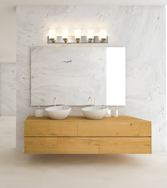 5 Light Vanity The clean lines of the Soledad vanity collection use white opal glass shades on chrome or matte black full sized wall plates to create a contrasting design. The fixtures are available in 1...Regular price $294.00 -