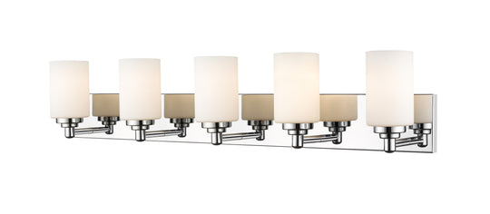 5 Light Vanity The clean lines of the Soledad vanity collection use white opal glass shades on chrome or matte black full sized wall plates to create a contrasting design. The fixtures are available in 1...Regular price $282.00 -