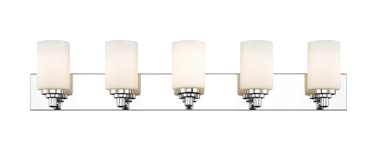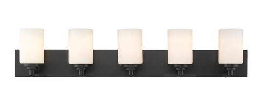 5 Light Vanity The clean lines of the Soledad vanity collection use white opal glass shades on chrome or matte black full sized wall plates to create a contrasting design. The fixtures are available in 1...Regular price $268.00