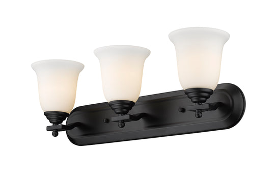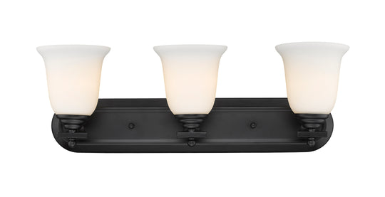3 Light Vanity --- An opulent set of three vanity lights in matte black finish and matte opal frosting. Specifications Style Number 703-3V-MB Install PDFs 703-3V-MB.pdf Actual Weight 7.19 Actual Length/ext 7 Actual Width 24.0 Actual...Regular price $144.00 -