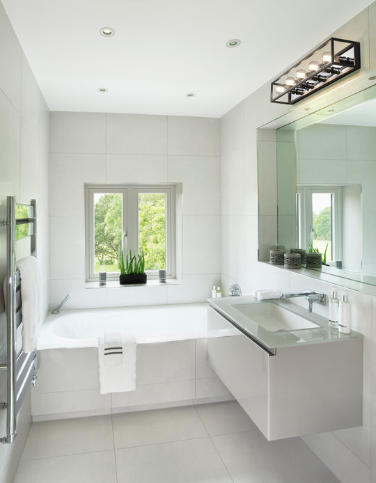 5 Light Vanity Kube displays the abstract combination of round and square. Square and rectangular shapes frame the round globe bulbs of the Kube collection. Contrasting finishes of matte black and chrome, or matte black and...Regular price $161.20 -