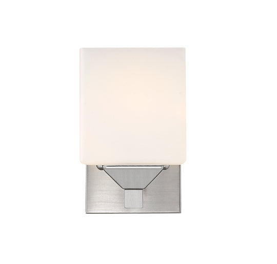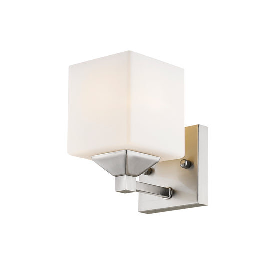 1 Light Wall Sconce --- Rectangular shaped hardware and a complimenting cube shade create a straight contemporary look. This wall sconce is finished in brushed nickel, and includes a matte opal shade. This fixture will add...Regular price $37.70 -