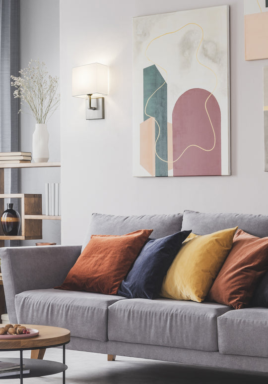 1 Light Wall Sconce Add a touch of modern appeal to your design with this sleek metal sconce, beautifully supported by a crisp off-white fabric shade. The clean look is reinforced by the sleek arm and...Regular price $118.00