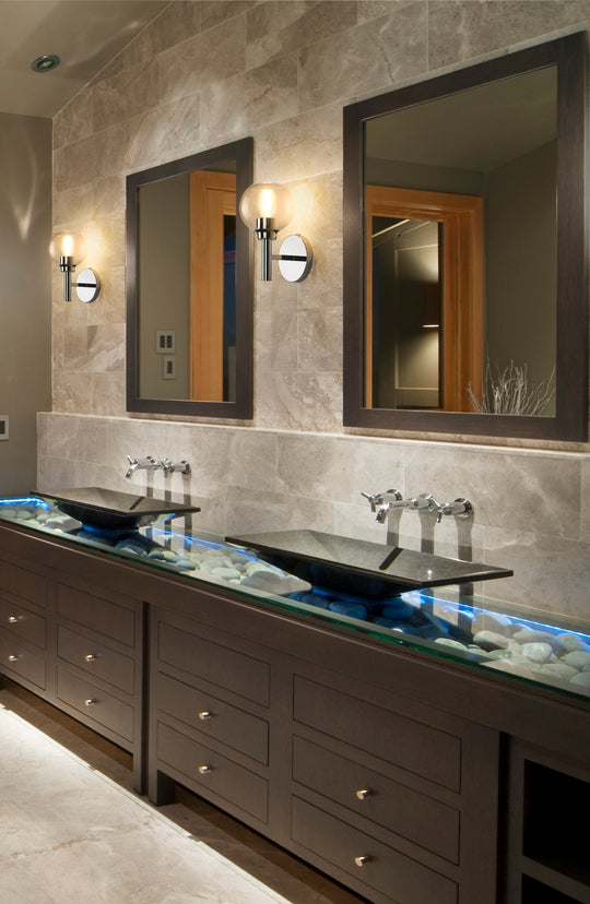 1 Light Wall Sconce Is there anything more perfect in design than a circle? The Sutton bath series embraces the familiar shape in its backplate and echoed by the open-edge globe shades that can be mounted...Regular price $82.00