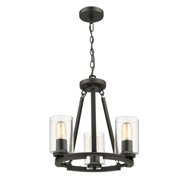 Vendor: Golden Monroe Three Light Chandelier in Matte Black with Gold Highlights Regular price $0.00Overlapping arcs come together to form contemporary rings, supporting cylindrical clear glass shades in this clean and modern design. The matte black finish has gold highlights and blends easily with many decors. Matching matte black socket...