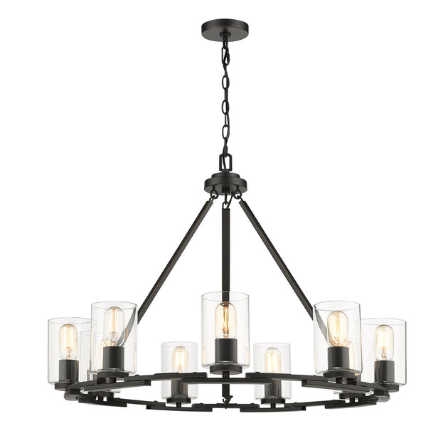 Vendor: Golden Monroe Nine Light Chandelier in Matte Black with Gold Highlights Regular price $0.00Overlapping arcs come together to form contemporary rings, supporting cylindrical clear glass shades in this clean and modern design. The matte black finish with gold highlights blends easily with many decors. Matching matte black socket covers...