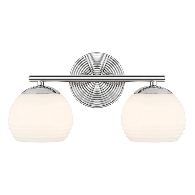 Vendor: Designers Fountain Moon Breeze Two Light Vanity in Polished Nickel Regular price $0.00The Moon Breeze collection evokes Hollywood from the 40's with its concentric circle design element and globe-shaped etched opal glass shades. Available in luxurious Brushed Gold or shiny Polished Nickel, these fixtures will add an element...