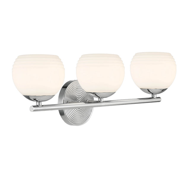 Vendor: Designers Fountain Moon Breeze Three Light Vanity in Polished Nickel Regular price $0.00The Moon Breeze collection evokes Hollywood from the 40's with its concentric circle design element and globe-shaped etched opal glass shades. Available in luxurious Brushed Gold or shiny Polished Nickel, these fixtures will add an element...