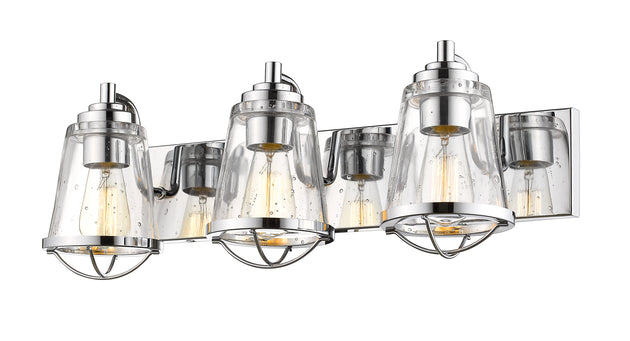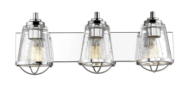 Regular price $256.003 Light Vanity --- This elegant three-light vanity fixture provides a fun maritime theme and a ton of character. Make its chrome steel and seedy glass build a focal point to emphasize a master or guest... -