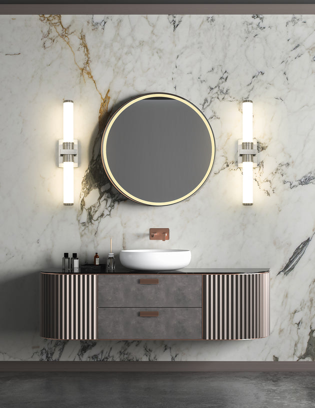 Regular price $264.001 Light Vanity The juxtaposition of a circular column nestled inside a square cuff gives this classic design fresh appeal. Decorative, detailed metal end caps in the same finish – a choice of Matte Black, Brushed... -