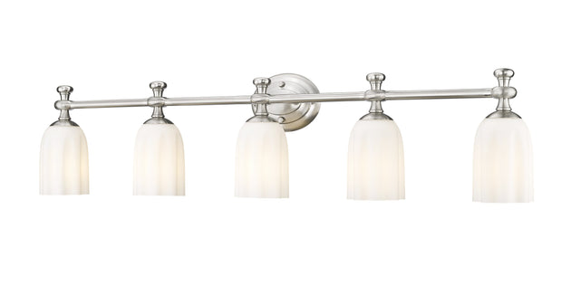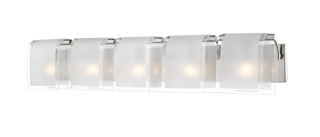 Regular price $480.005 Light Vanity --- Bent frosted glass shades are hung over brushed nickel hardware on this 5 light vanity to create a modern touch for any room. Specifications Style Number 169-5V-BN Install PDFs 169-5V-BN.pdf Actual Weight... -