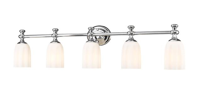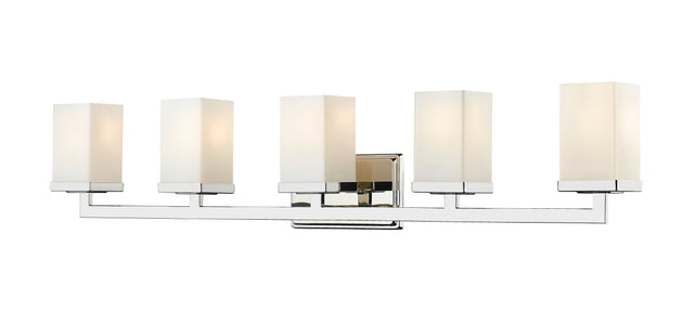 Regular price $334.005 Light Vanity --- This five light vanity fixture provides a clean modern look with its use of rectangular matte opal shades and chrome geometric inspired hardware. This fixture can either be hung up or down,...