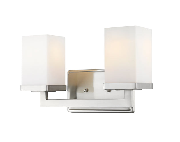 Regular price $152.002 Light Vanity --- This two light vanity fixture provides a clean modern look with its use of rectangular matte opal shades and brushed nickel geometric inspired hardware. This fixture can either be hung up or... -