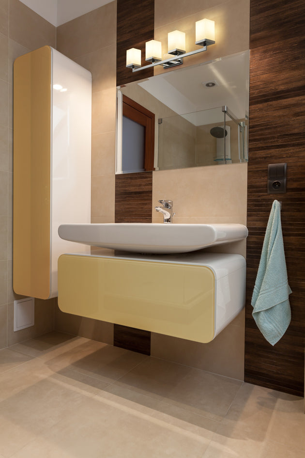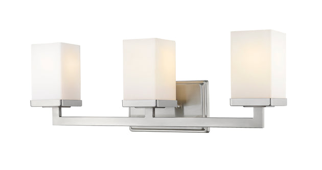 Regular price $200.003 Light Vanity --- This three light vanity fixture provides a clean modern look with its use of rectangular matte opal shades and brushed nickel geometric inspired hardware. This fixture can either be hung up or... -