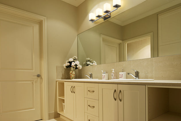 Regular price $244.004 Light Vanity --- This four light vanity fixture provides a clean modern look with its use of rectangular matte opal shades and brushed nickel geometric inspired hardware. This fixture can either be hung up or... -
