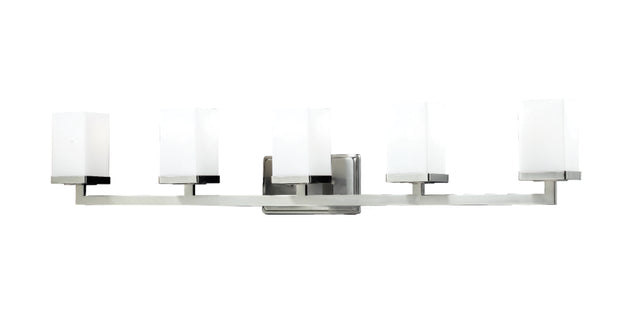 Regular price $318.005 Light Vanity --- This five light vanity fixture provides a clean modern look with its use of rectangular matte opal shades and brushed nickel geometric inspired hardware. This fixture can either be hung up or... -