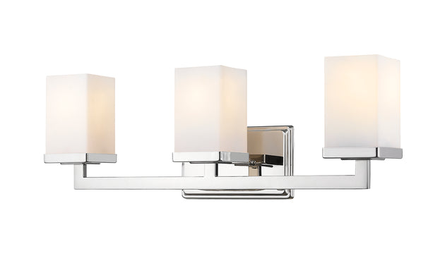 Regular price $208.003 Light Vanity --- This three light vanity fixture provides a clean modern look with its use of rectangular matte opal shades and chrome geometric inspired hardware. This fixture can either be hung up or down,... -