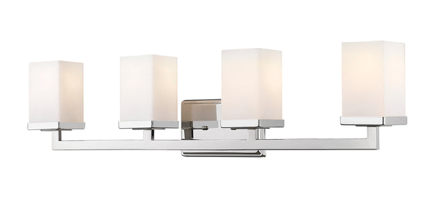 Regular price $252.004 Light Vanity --- This four light vanity fixture provides a clean modern look with its use of rectangular matte opal shades and chrome geometric inspired hardware. This fixture can either be hung up or down,... -
